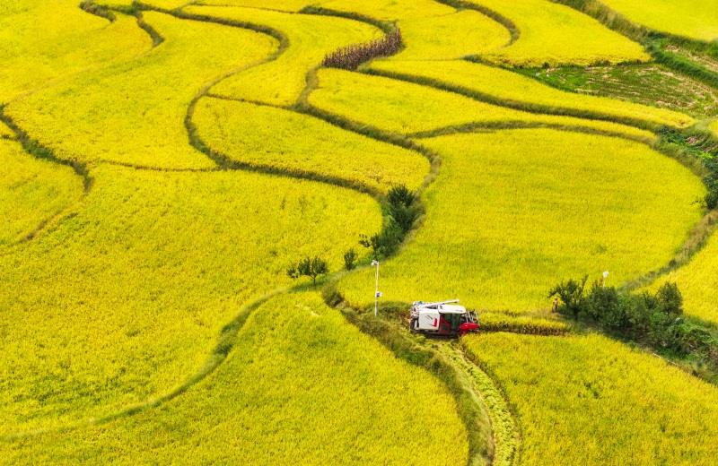丰收时节,收割机穿梭在金色的稻田间。熊伟摄